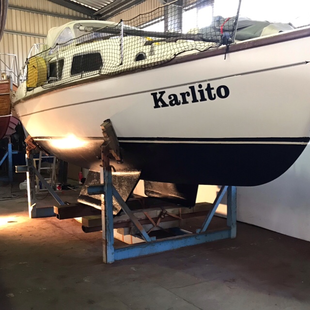 Nach einem anstrengenden Wochenende in Cuxhaven ist das Boot jetzt bereit für den Kran. Das neue Antifouling sieht gut aus. Leider ist die Standheizung noch nicht fertig.