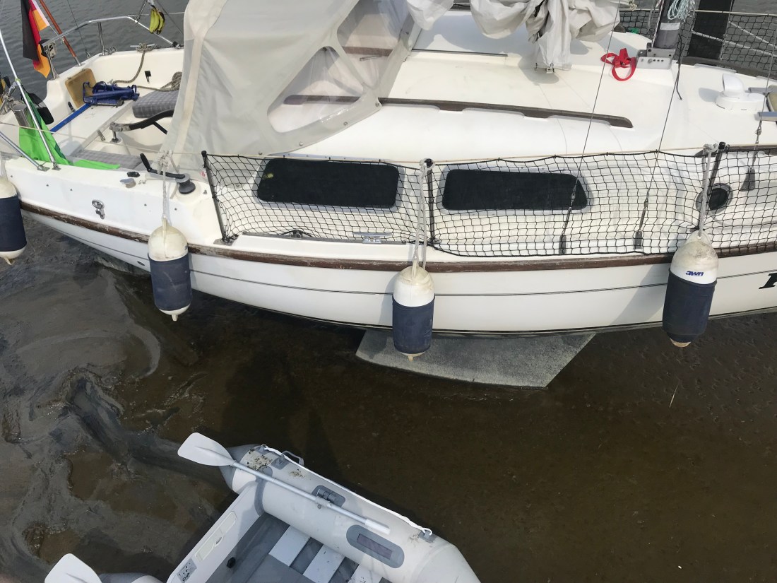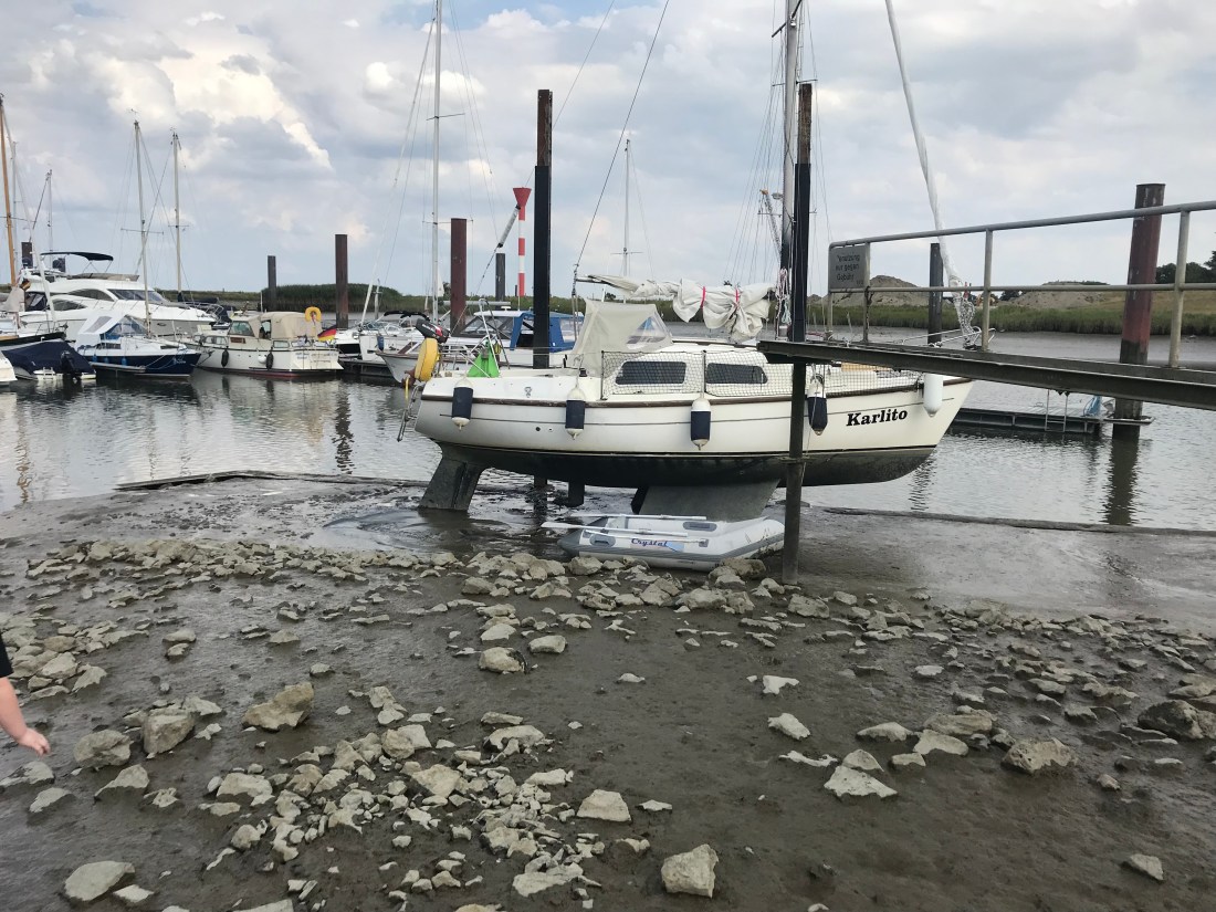 So habe ich mir das nicht vorgestellt. Wir waren keine 10 Seemeilen vor Cuxhaven, noch 300 zu fahren, und schon in Seenot. Nach kurzer Zeit kam ein kleiner Seenotkreuzer in Sicht und nahm uns in Schlepp. Nach kurzer Fahrt machten wir in Otterndorf fest. Was für eine Erleichterung. Kein schaukeln mehr, die Kinder sind in Sicherheit. Ich hatte die Nase voll, meine Frau um so mehr. Gedanken das Boot zu verkaufen kommen mir. Aber wer kauft schon ein kaputtes Boot? Und was sollen wir die restlichen vier Wochen machen? Zuhause rumsitzen kam nicht in frage. Zwar gibt es keinen Kran in Otterndorf, aber eine Trockenfallanlage. Bei Ebbe steht das Boot dann auf einer Betonplatte. Perfekt, schließlich ist Karlito ein Kimmkieler. Mit dem Vereinsboot wird Karlito also in die Anlage geschleppt. Dann heißt es warten. In der Zwischenzeit entdecken wir das ein schöner Strand in der Nähe ist. Ein kleiner Spielplatz ist auch da. Glück im Unglück.