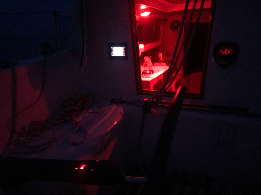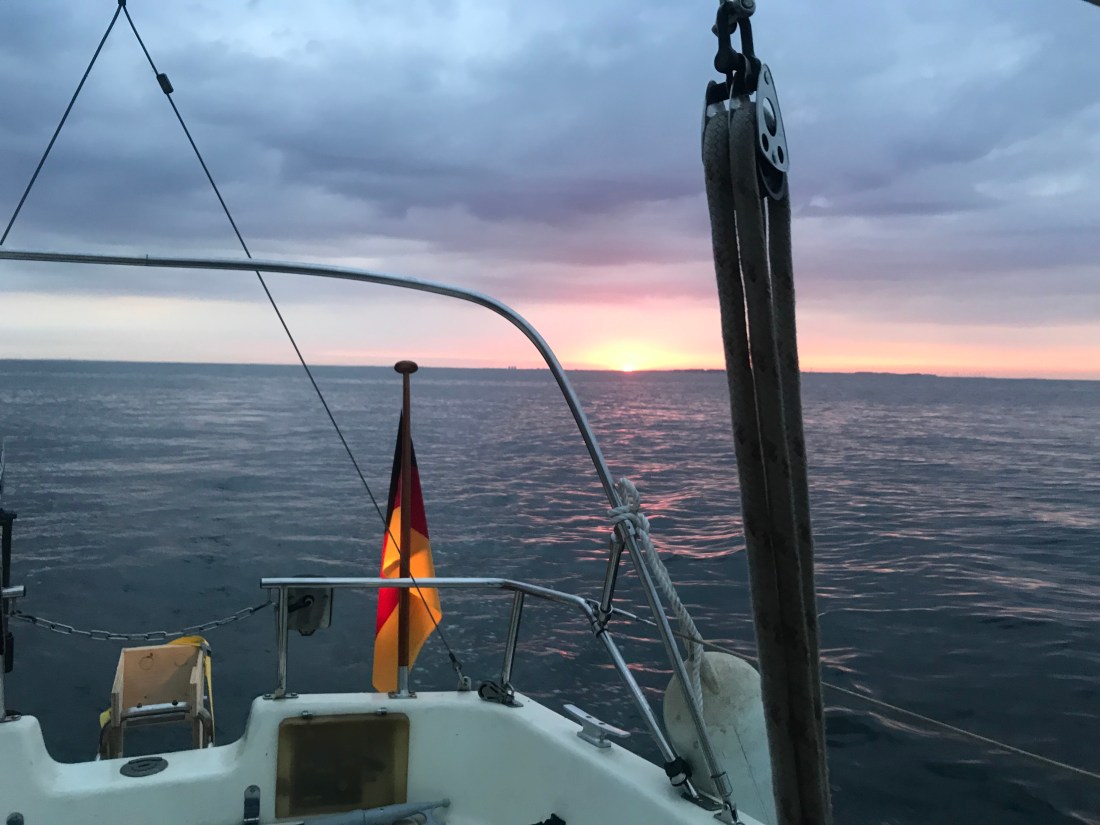 Ein paar Stunden nach Sonnenuntergang frischt der Wind etwas auf und dreht. Ich kann den Motor aus machen und segeln. Karlito fährt leise durch die Dunkelheit. Ich bin nur müde, aber zwinge mich durchzuhalten. Die Batterie entlädt sich schneller als mir lieb ist. Navigationslichter, Kartenplotter, Autopilot und die Leuchten unter Deck saugen um die 5 Ampere aus der 80 Ah Batterie. Nach einer Stunde ist der Wind fast völlig eingeschlafen und ich starte wieder den Motor. Der laute Motor hat den Vorteil das man nicht einschlafen kann. Er wird mich wach halten. Ich nutze die Zeit um etwas Navigation zu üben. Meist verlasse ich mich blind auf den Kartenplotter. Natürlich habe ich auch einen kompletten Satz Seekarten an Bord, die auch immer auf dem Tisch liegen, aber Zirkel und Dreieck nutze ich kaum. Nachts ist es nochmal schwieriger sich zu orientieren. Ein paar Lichter in der Ferne kann ich gut in der Karte wiederfinden. Rostock ist auch schon aus großer Entfernung zu erahnen, am diffusen Leuchten. Bald bin ich zu müde um die Übungen weiter zu führen. Ich halte also Ausschau und lege mich dann 20 Minuten unter Deck hin, zum ausruhen, nicht zum schlafen. Dann wieder Ausschau halten. Länger als 20 Minuten traue ich mich nicht unter Deck zu bleiben. Es sind viele große Schiffe Richtung Rostock unterwegs. Vermutlich Containerschiffe und Fähren. Hell erleuchtet fahren sie durch die Nacht und kreuzen meine Route. Ob Karlito auf dem Radar zu sehen ist? Wirklich nah kommt mir keines der großen Pötte. Stunden vergehen, die andere Seite der Mecklenburger Bucht kommt langsam näher.