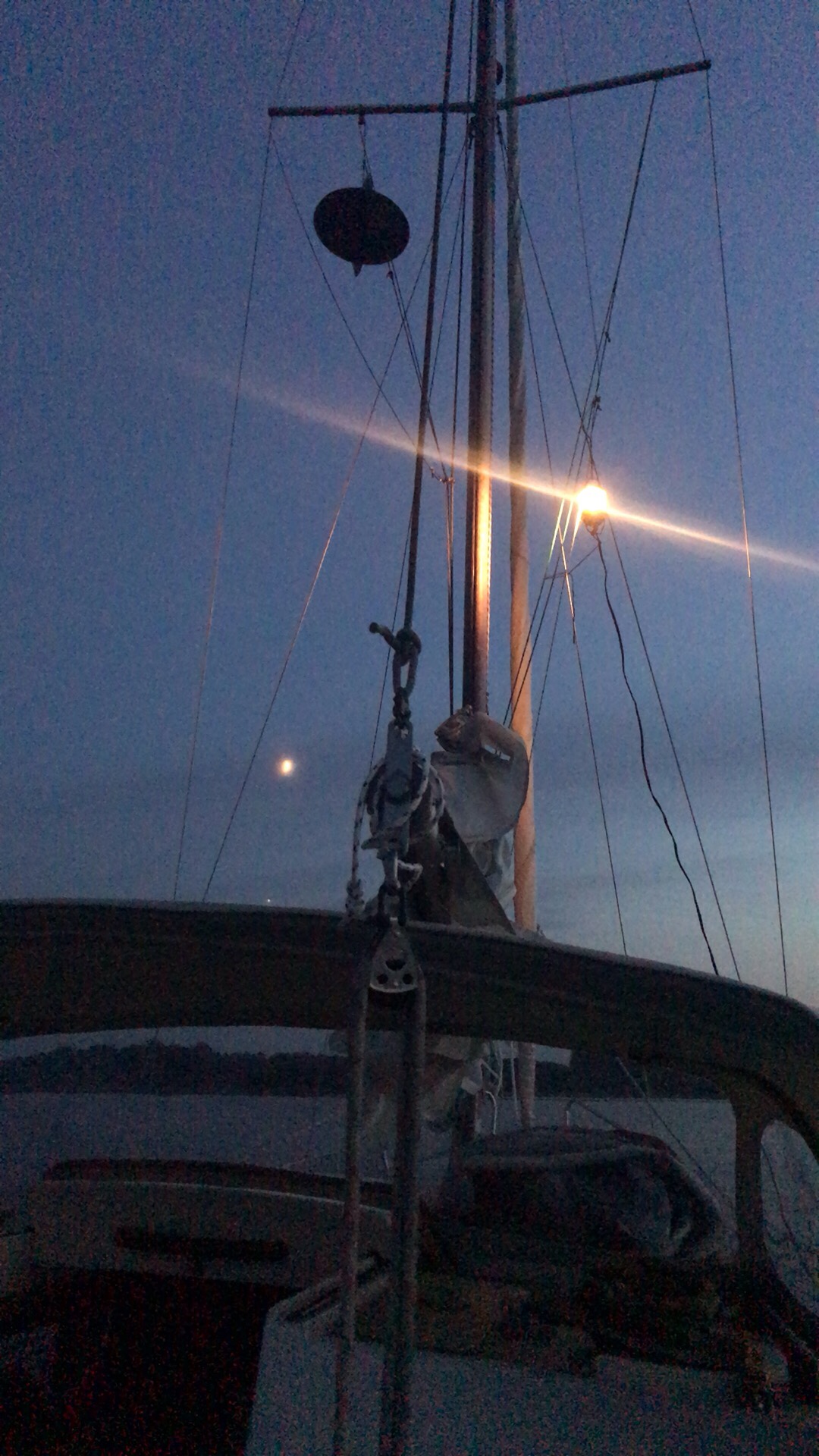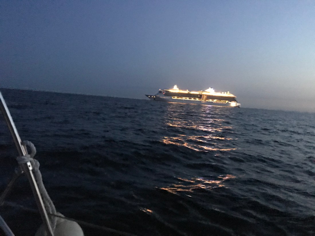 Der Wetterbericht stellt sich als etwas zu optimistisch heraus. Es ist viel weniger Wind als angekündigt, außerdem aus einer anderen Richtung. Ich fahre fast gegenan, bleibt nur unter Motor zu fahren. Als es dunkel wird verschwinden fast alle kleinen Boote und Yachten, nur ein großer Zweimaster kreuzt hinter mir durch die Nacht. In der Ferne viele Fähren, insgesamt viel mehr los als ich gehofft hatte. Es wird wohl keinen Schlaf geben heute Nacht. Zum Glück ist es nicht so dunkel wie befürchtet. Kaum Wolken am Himmel und der Mond scheint hell. Ich hatte es mir bedrohlicher vorgestellt alleine durch die Nacht zu fahren.