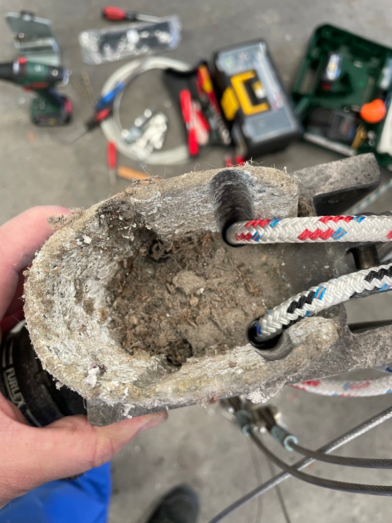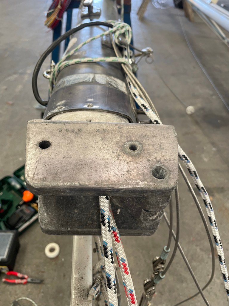 Als alles montiert war, konnten die alten Kabel raus. Der neue Kabelbaum war deutlich umfangreicher. Wie die alten Kabel im Mast verlaufen wusste ich nicht. Gibt es ein Leerrohr, oder hängen die Kabel einfach so rum? Ich hatte mir darüber vorher Gedanken gemacht und war auf alles vorbereitet. Das letzte was ich möchte ich ein Kabelbaum der bei jeder Welle innen an den Mast schlägt und mir den Schlaf raubt. Der Mastfuß musste demontiert werden, was nicht einfach war. Es waren nicht mehr die originalen Nieten verbaut. Scheinbar hat jemand billige Nieten aus dem Baumarkt verwendet. Sie waren schon teilweise verrostet.