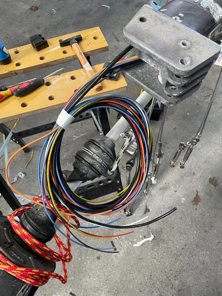 Ursprünglich gab es nur eine Lampe im Mast. Das Dampferlicht, das unterhalb der Saling montiert ist. Das Ankerlicht musste immer an einer Leine gehisst werden. Mein Plan war ein Toplicht oben auf dem Mast zu montieren, also mit Ankerlicht und eine Dreifarbenlaterne. Ein Deckstrahler, eine Funkantenne und ein Windsensor sollte auch mit auf den Mast. Ziemlich viel für so ein kleines Boot, aber wenn schon, denn schon. Diesmal sollten es nur verzinnte Kabel sein, die hoffentlich lange halten. Im Winter 2021 war es dann soweit. Alles Material war gekauft, die Kabelbäume vorbereitet.