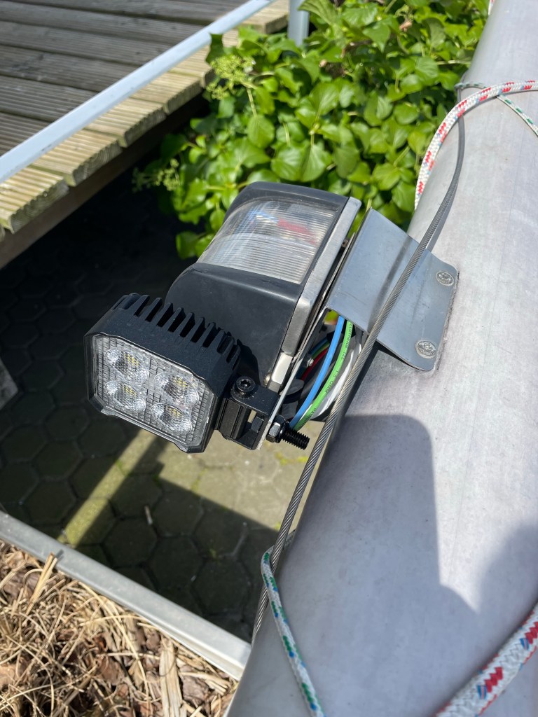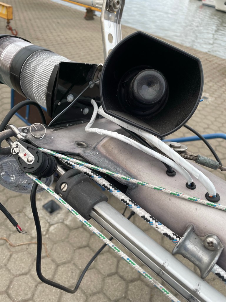 Einen Ausgang für die neuen Kabel zu finden war nicht leicht. Es gibt nur sehr kleine Öffnungen durch die man hineingreifen kann. Vor allem das NMEA 2000 Kabel war eine Herausforderung. Das Anklemmen an den Lampen, war vergleichsweise einfach. Pünktlich zum Kranen war alles soweit fertig dass der Mast wieder gesetzt werden konnte. Der Aufwand mit dem Kabelbaum hat sich jedenfalls gelohnt. Im ersten Sommer nach dem Mastrefit war kein Klappern, oder sonstige Geräusche zu hören. Der ruhige Schlaf ist gesichert.